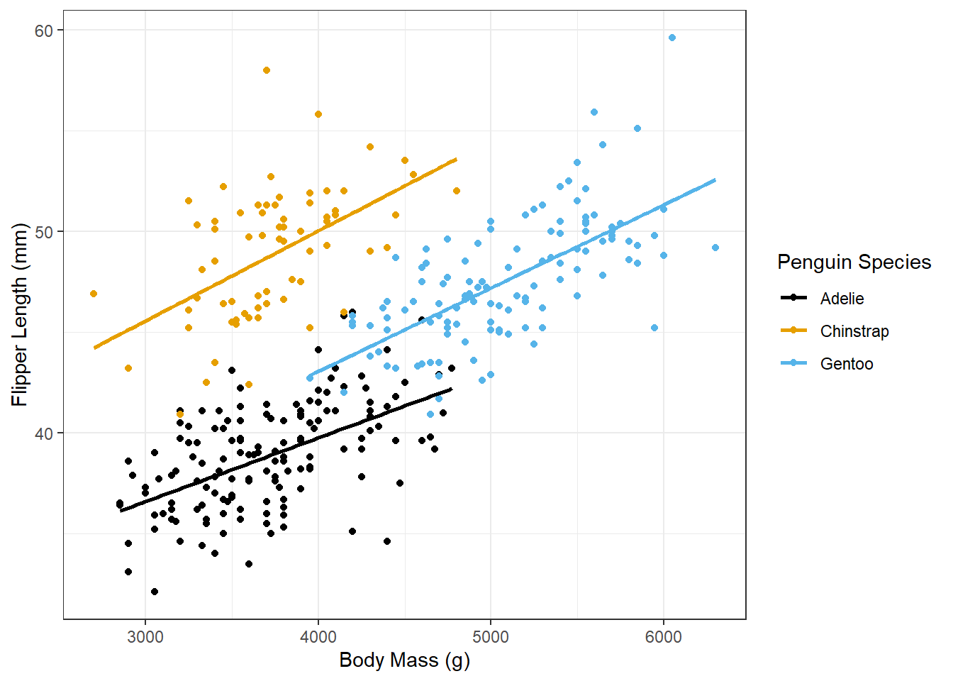penguins %>%drop_na() %>%ggplot(aes(x = body_mass_g, y = bill_length_mm), color = species) +geom_point(aes(color = species))+geom_smooth(method ="lm", se =FALSE, aes(color = species)) +scale_color_colorblind() +theme_bw() +labs(x ="Body Mass (g)",y ="Flipper Length (mm)",color ="Penguin Species" )